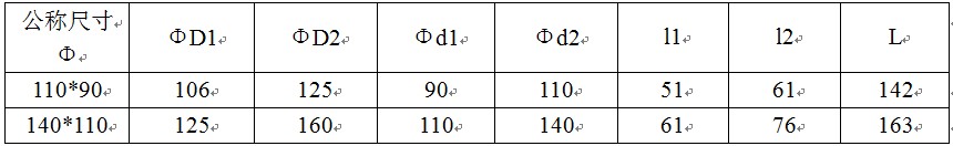 其中“ΦD1”表示管件小头公称外径,“Φd1”表示管件小头公称内径,“L”管件长度,“l1”表示管件小头承插口长度,“Φd2”表示管件大头公称内径,“ΦD2”管件大头公称外径,“l2”表示管件大头承插口长度,1.0MPa=10公斤